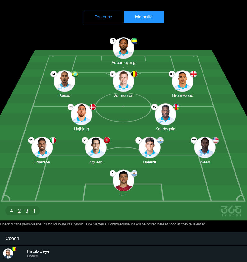 มาร์กเซยมา 4-2-3-1 ทรงนี้ชัดเลยว่า “บุกด้วยคุณภาพ” มีตัวทำเกมและตัวจบครบ Greenwood กับ Vermeeren เป็นจุดเชื่อมเกมสำคัญ ส่วนหน้าเป้าอย่าง Aubameyang ถ้าพื้นที่เมื่อไหร่ มีโอกาสเปลี่ยนเป็นประตูได้ตลอด เกมนี้ด้านแท็กติก วิเคราะห์บอล กันตรงๆ คือมาร์กเซยต้องระวังโดนสวนหลังวิงแบ็ก เพราะตูลูสวางตัวรอแทงทะลุได้เหมือนกัน
