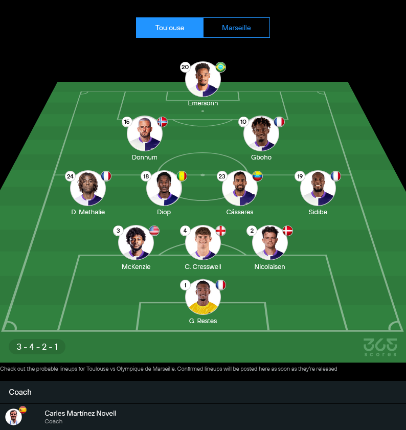 ตูลูสมาในทรง 3-4-2-1 เน้นวิงแบ็กขึ้นลงไว แล้วใช้สองตัวทำเกมหลังหน้าเป้าคอยปั่นจังหวะ ถ้าจะให้พูดแบบนักลงทุนบอลคือ เกมนี้ตูลูสต้องเล่นให้ “รัดกุมแต่ไม่ถอย” เพราะถ้าปล่อยให้มาร์กเซยครองเกมนานๆ เดี๋ยวโดนคุณภาพแนวรุกบดเอา