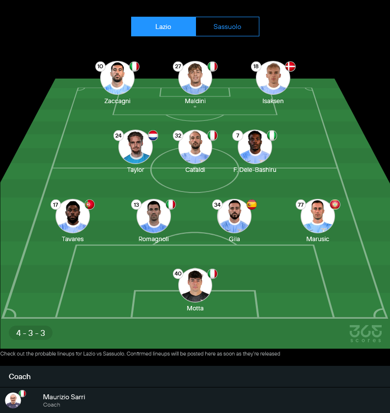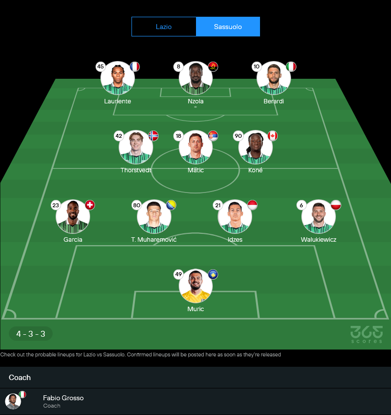 11 ตัวจริงคาดการณ์ ซาสซูโอโล่ 4-3-3