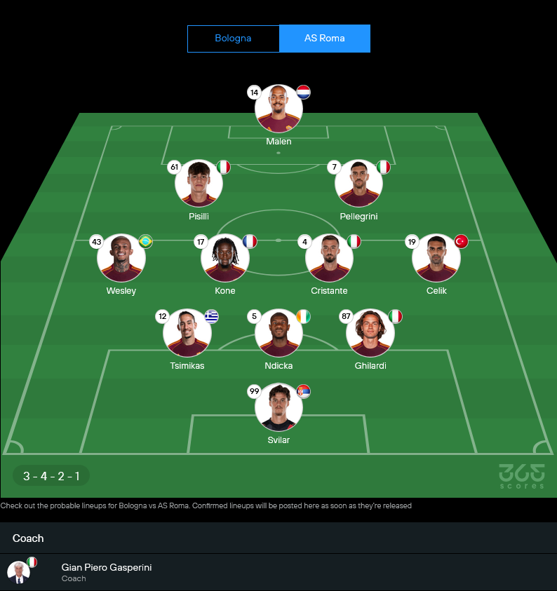 โรม่า ของ จาน ปิเอโร่ กาสเปรินี่ จะยึดระบบ 3-4-2-1 แต่ปัญหาคือแนวรุกหายหลายราย ทั้ง ดอฟบิค, เฟอร์กูสัน, ซูเล่ และ ดีบาล่า แถมแนวรับยังไม่มี มันชินี่ ที่ติดโทษแบนอีก ทำให้เกมนี้ต้องฝากความหวังไว้ที่ ดอนเยลล์ มาเล่น เป็นหลัก