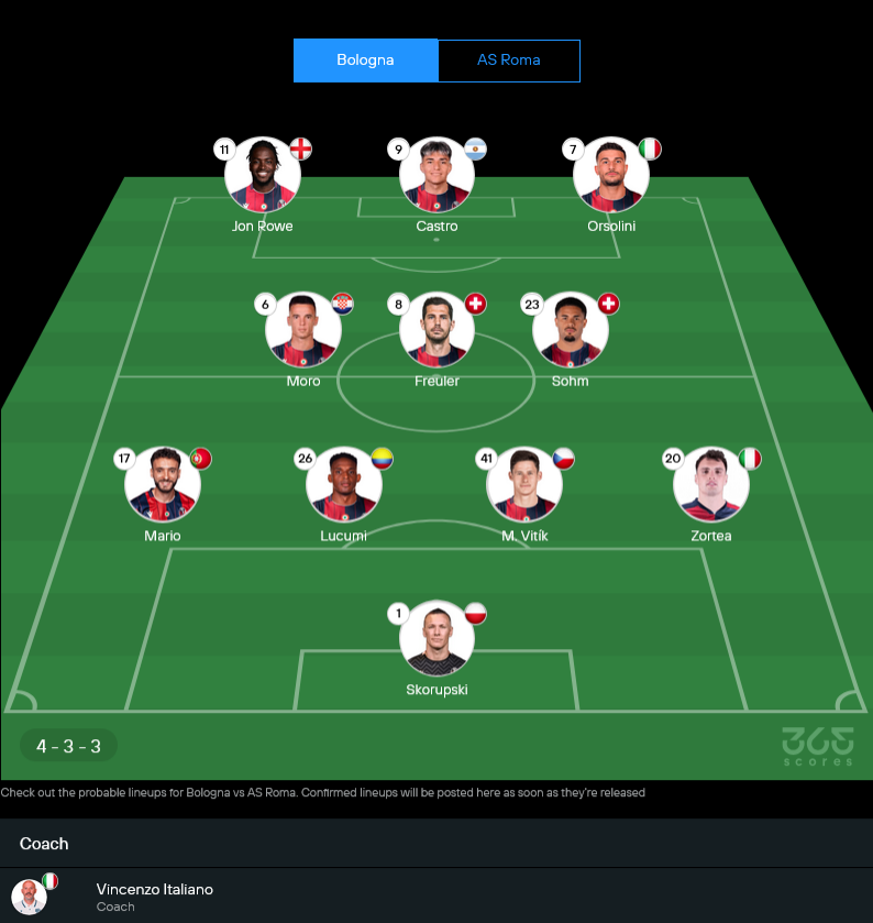 เจ้าบ้านของ วินเชนโซ่ อิตาเลียโน่ มาในระบบ 4-3-3 โดยมีข่าวดีคือ ฆวน มิรันด้า กับ ทอร์บยอร์น เฮกเกม กลับมาซ้อมได้แล้ว แม้ยังต้องเช็กว่าจะออกสตาร์ตไหม ขณะที่ เรโม ฟรอยเลอร์ พร้อมคืนแดนกลาง ทำให้ภาพรวมทีมดูแน่นขึ้นมาก ในมุม วิเคราะห์บอล ถือว่าโบโลญญ่าพร้อมชนและมีทรงพอจะยันเกมนี้ได้