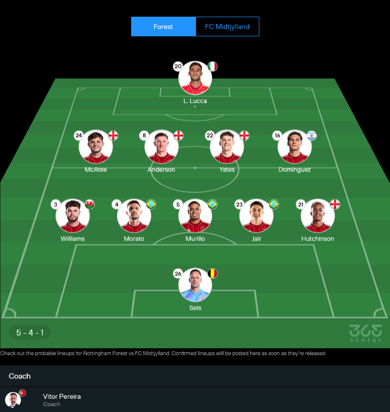 ฟอเรสต์ของ วิตอร์ เปไรร่า ยังมีตัวเจ็บหลายรายทั้ง คริส วู้ด, วิลลี่ โบลี่, นิโคโล่ ซาโวน่า และ จอห์น วิกตอร์ ส่วน สเตฟาน ออร์เตก้า ยังต้องเช็กความฟิต คาดว่าเกมนี้จะยึดระบบ 3-4-2-1 หรือขยับเป็น 5-4-1 ตามจังหวะ โดยใช้เกมริมเส้นกับตัวรุกด้านหลังช่วยกันทำเกม หากมองในเชิง วิเคราะห์บอล เจ้าถิ่นคงพยายามเปิดเกมบุกตั้งแต่ต้นเพื่อเอาคืนให้เร็วที่สุด