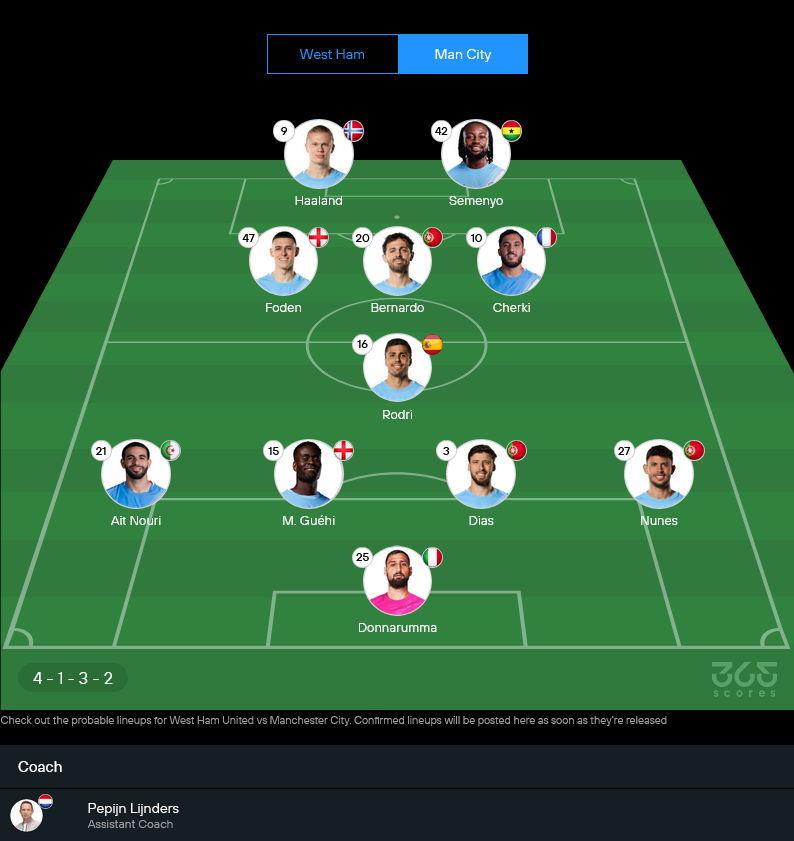 เป๊ป กวาร์ดิโอล่า ยังน่าจะยึดระบบ 4-1-3-2 เหมือนเดิม จุดแข็งคือแดนกลางคุมเกมได้แน่น และแนวรุกมีตัวจบสกอร์หลายทาง แม้จะมีตัวเจ็บอยู่บ้าง แต่คุณภาพโดยรวมยังเหนือกว่าเจ้าบ้านชัดเจน