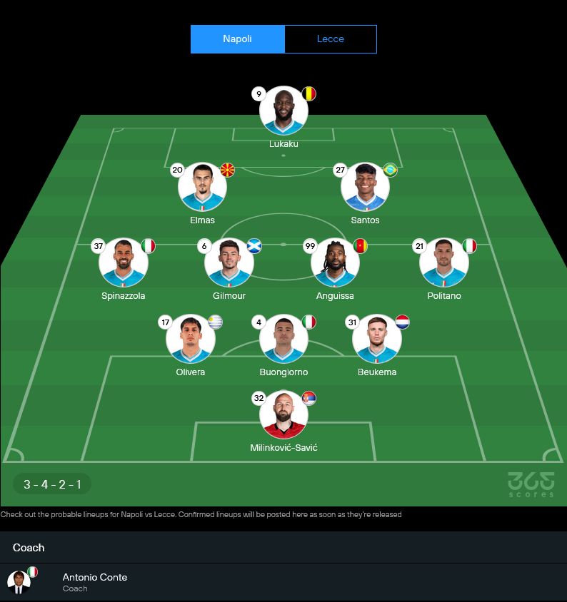 คอนเต้ยังมีปัญหาตัวเจ็บหลายราย ทั้ง ดิ ลอเรนโซ่, ราห์มานี่, โลบ็อตก้า และ ดาวิด เนเรส แต่ข่าวดีคือ อองกิสซ่า กลับมาเป็นตัวเลือกได้อีกครั้ง ทำให้แดนกลางมีพลังมากขึ้น เกมนี้คาดว่าจะมาในระบบ 3-4-2-1 ซึ่งถือว่าเหมาะกับการคุมเกมใส่คู่แข่งแบบนี้มาก และถ้ามองในแง่ วิเคราะห์บอล นาโปลียังดูครบเครื่องกว่าเยอะ