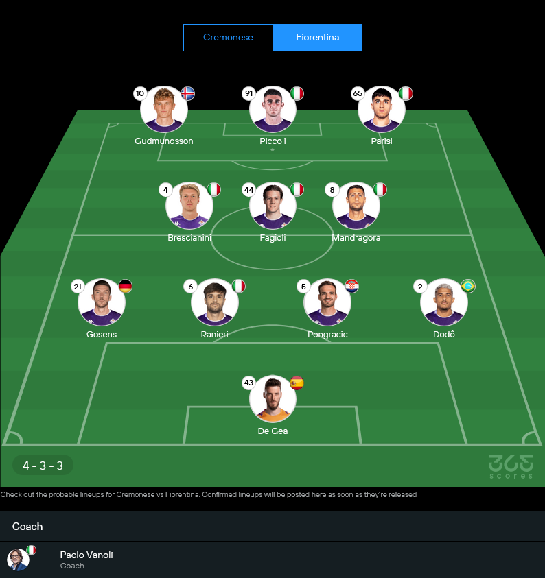 11 ตัวจริงคาดการณ์ ฟิออเรนติน่า 4-3-3