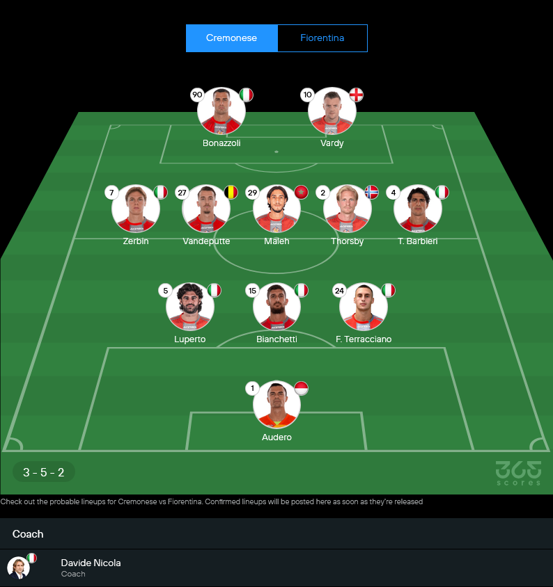 เจ้าถิ่นของ ดาวิเด้ นิโคล่า ยังอยู่ในช่วงกดดันหนัก ไม่ชนะในลีกมา 14 เกมติด สภาพทีมเกมนี้ยังมีตัวเจ็บอย่าง เฟเดริโก้ บาสชิร็อตโต้, มิเคเล่ คอลโลโคโล่ และ ฟาริส มูมบาญญ่า ส่วน จูเซ็ปเป้ เปซเซลล่า ติดโทษแบน แต่ข่าวดีคือ ฟิลิปโป แตร์รัชชาโน่ กลับมาช่วยทีมได้ ทำให้ระบบ 3-5-2 ยังพอจัดทรงได้ ในมุม วิเคราะห์บอล เกมนี้เครโมเนเซ่น่าจะมาแบบเน้นรัดกุม รอจังหวะสวนและฝากความหวังไว้ที่คู่หน้าอย่าง เจมี่ วาร์ดี้ กับ เฟเดริโก้ โบนาสโซลี่