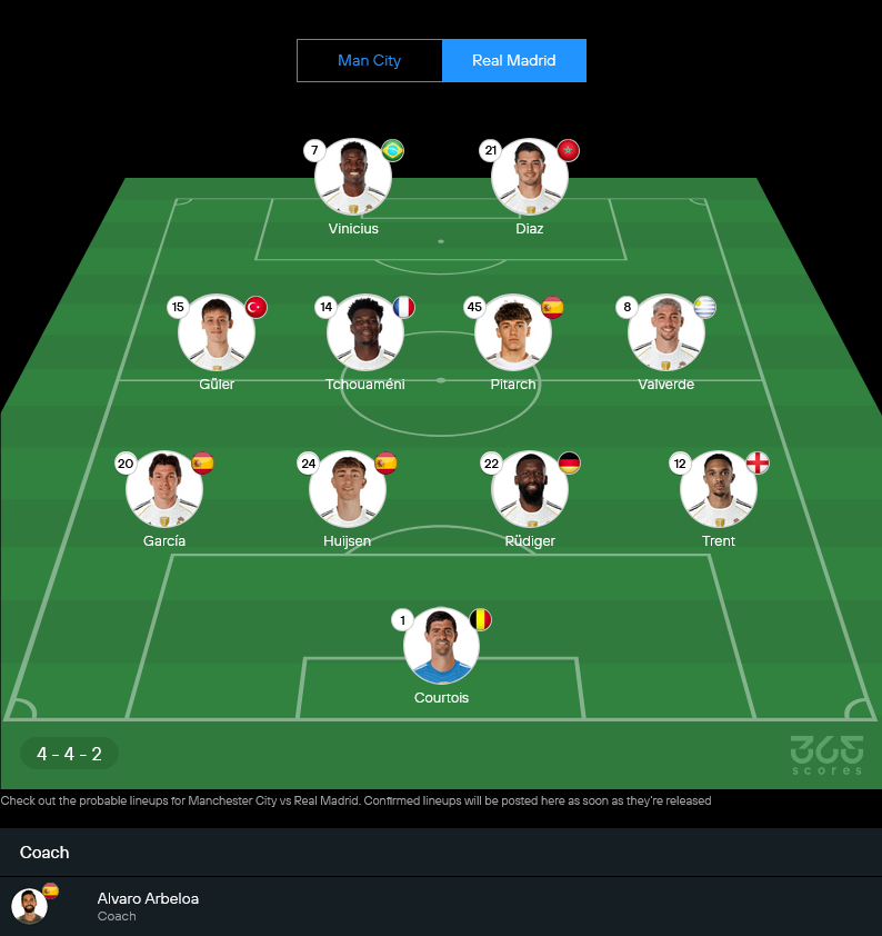 ฝั่งมาดริดยังมีตัวเจ็บหลายราย ไม่ว่าจะเป็น คีลิยัน เอ็มบัปเป้, โรดรีโก้, ดานี่ เซบายอส, เอแดร์ มิลิเตา, ดาวิด อลาบา, แฟร์กล็องด์ เมนดี้, ราอูล อเซนซิโอ และ จู๊ด เบลลิงแฮม แต่ขุมกำลังที่เหลือยังแข็งพอสำหรับเกมใหญ่ คาดว่าจะยึดระบบ 4-4-2 เน้นเกมรับแน่นแล้วรอสวนด้วยความเร็วของ วินิซิอุส กับ ดิอาซ