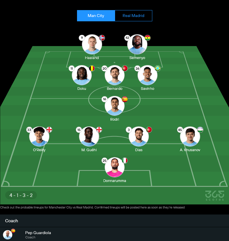 เป๊ป กวาร์ดิโอล่า ยังหมดสิทธิ์ใช้งาน ยอสโก้ กวาร์ดิโอล, มาเตโอ โควาซิช, แม็กซ์ แอลเลย์น และ ริโก้ ลูอิส ทำให้ตัวเลือกบางจุดลดลงพอสมควร เกมนี้คาดว่าจะมาในระบบ 4-1-3-2 ให้ โรดรี คุมจังหวะตรงกลาง แล้วใช้ โดกู, แบร์นาร์โด้ และซาวินโญ่ ปั้นเกมสนับสนุน ฮาลันด์ กับ เซเมนโย่