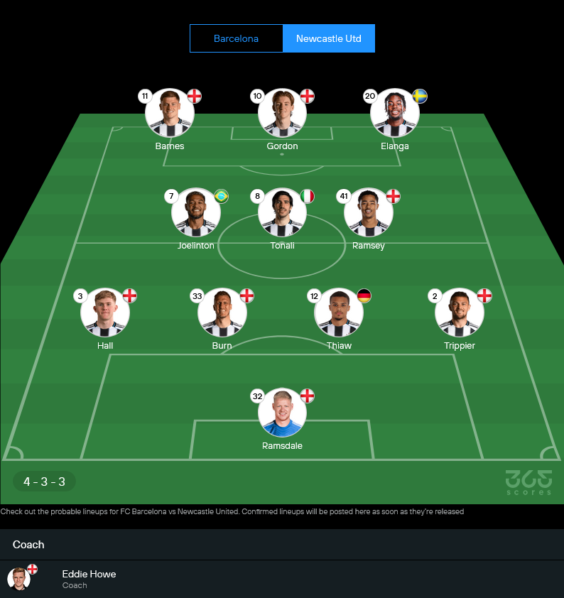 ฝั่งทีมเยือนยังไม่มี บรูโน่ กีมาไรส์, เอมิล คราฟธ์, ฟาเบียน ชาร์ และ ลูอิส ไมลีย์ ส่วน ซานโดร โตนาลี่ กับ โจ วิลล็อค ยังต้องเช็กฟิต แต่ชุดหลักที่เหลือยังพร้อมลงสนามในระบบ 4-3-3 โดยมี กอร์ดอน, อีลังก้า และ บาร์นส์ เป็นทีเด็ดเกมรุก จุดขายของทีมนี้ยังเป็นเกมเปลี่ยนจากรับเป็นรุกที่เร็วและแรง