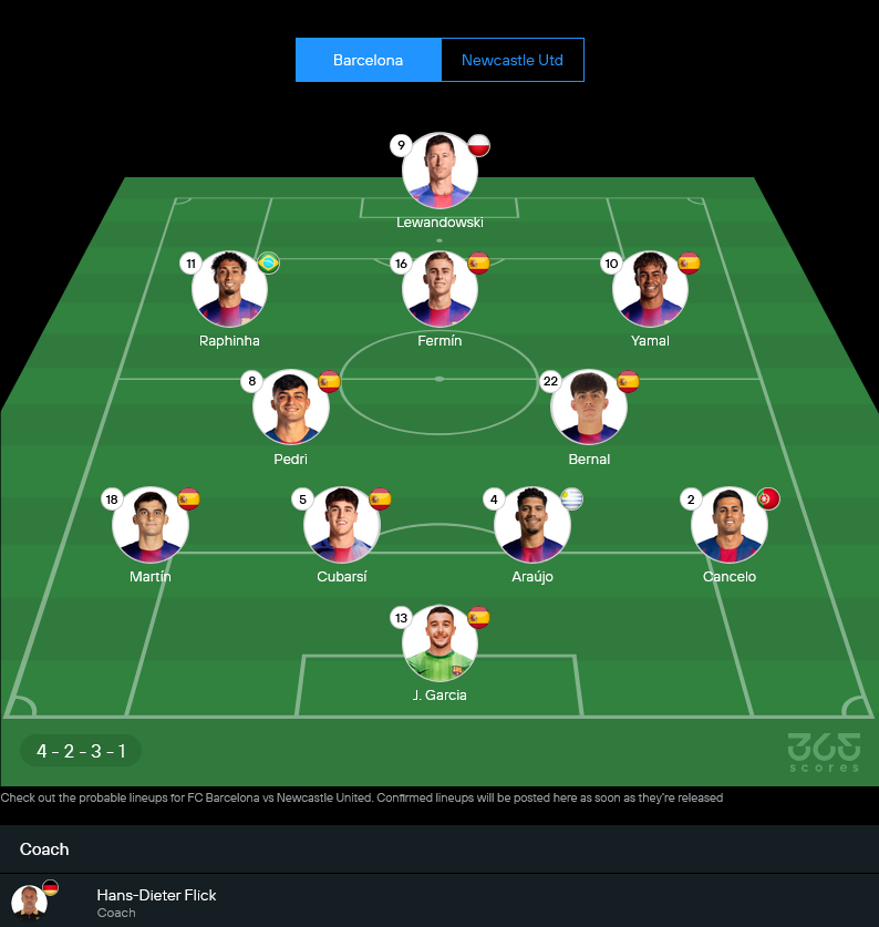 เจ้าบ้านยังไม่มี อันเดรียส คริสเตนเซ่น, อเลฮานโดร บัลเด้, ฌูลส์ คุนเด้ และ เฟรงกี้ เดอ ยอง แต่ขุมกำลังหลักที่เหลือยังพร้อมลุยเต็มที่ เกมนี้คาดว่าจะมาในระบบ 4-2-3-1 หรือขยับเป็น 4-3-3 ตามจังหวะ โดยแกนรุกยังฝากความหวังไว้กับ ยามาล, ราฟินญ่า และ เลวานดอฟสกี้ ซึ่งเป็นชุดที่อันตรายมาก ใครดู วิเคราะห์บอลวันนี้ คู่นี้จะเห็นเลยว่า บาร์ซ่าน่าจะเน้นบุกกดตั้งแต่ต้นเกม