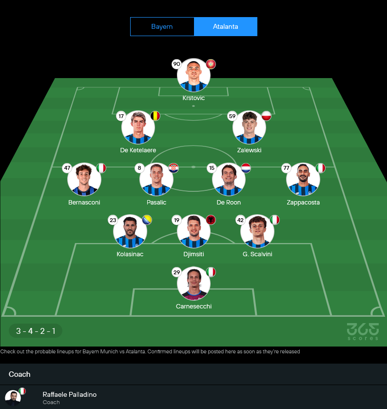 11 ตัวจริงที่คาด อตาลันต้า (3-4-2-1)