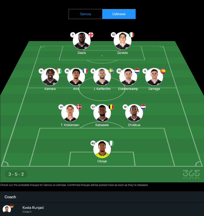 11 ตัวจริงคาดการณ์ อูดิเนเซ่ (3-5-2)