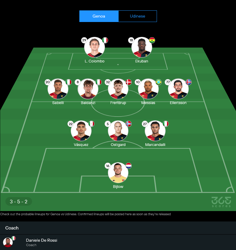 11 ตัวจริงคาดการณ์ เจนัว (3-5-2)
