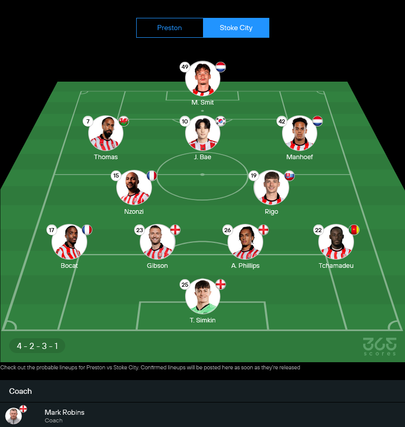 เปรสตันของ พอล เฮ็คกิ้งบ็อตท่อม ยังมีปัญหาตัวเจ็บต่อเนื่อง ทั้ง คัลลั่ม แลง, ลูอิส กิ๊บสัน, อาลี แม็กแคนน์ และ มิลูติน ออสมายิช ทำให้การจัดทัพยังต้องเน้นรัดกุม คาดว่าจะยึดระบบ 5-3-2 ใช้ แดเนียล เจ๊บบิสัน กับ ลูอิส ด๊อบบิน เป็นคู่ล่าตาข่ายเหมือนเดิม