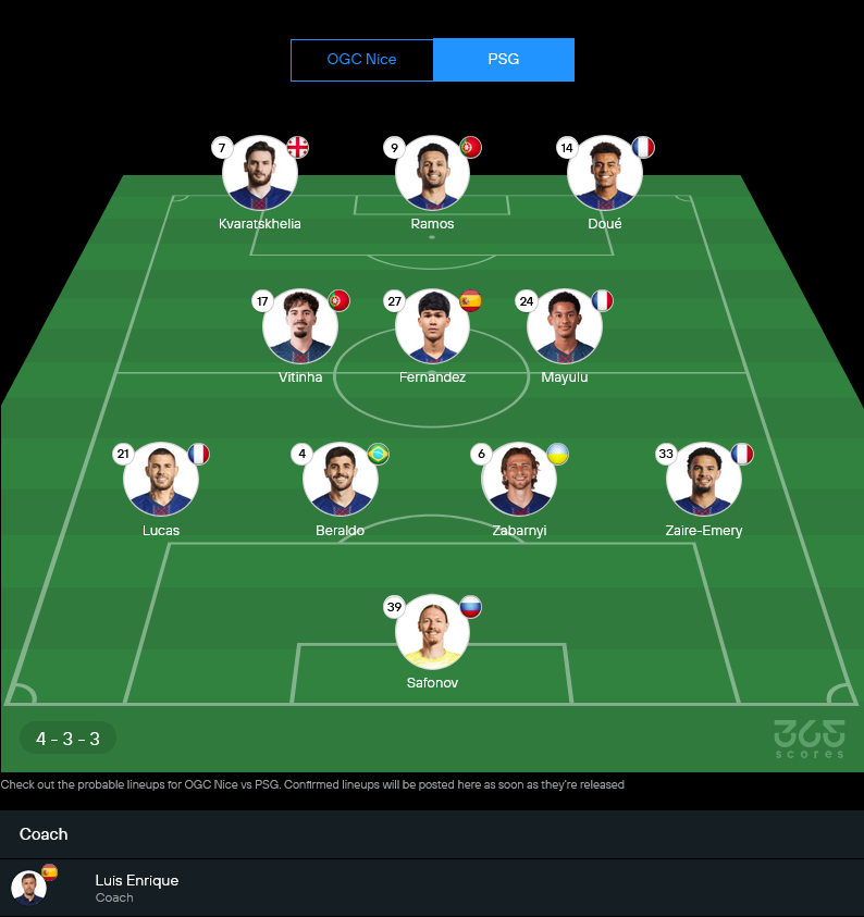 ฝั่งเปแอสเชยังน่าจะยึด 4-3-3 ตามถนัด ถึงจะไม่มี อัชราฟ ฮาคิมี่ ที่ติดโทษแบน รวมถึงมีปัญหาของ แบรดลีย์ บาร์โกล่า และ ฟาเบียน รุยซ์ แต่ภาพรวมยังดูแน่นกว่าชัดเจน โดยเฉพาะแดนกลางที่มีวิตินญ่าคุมเกม และแนวรุกที่เต็มไปด้วยตัวจบสกอร์กับตัวลากกินตัว