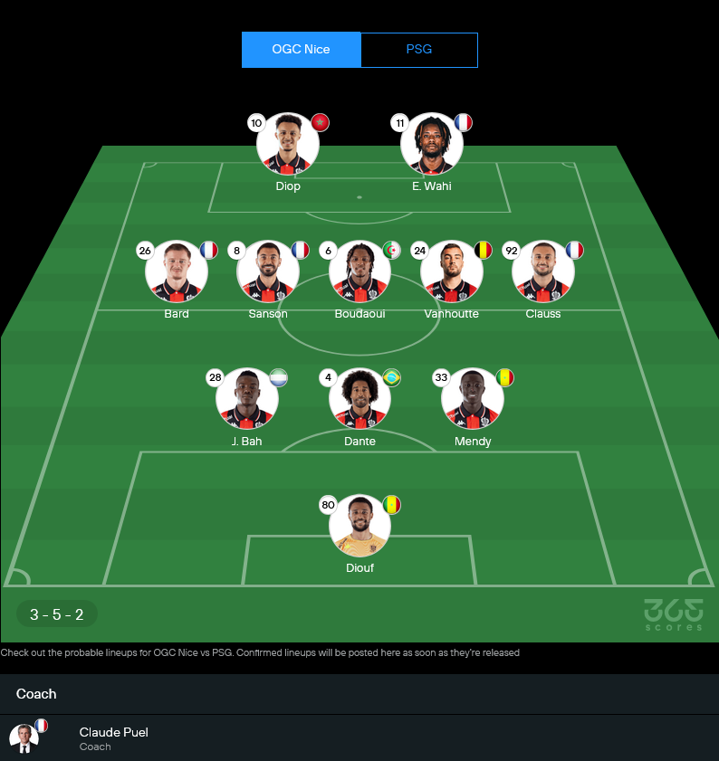 11 ตัวจริงคาดการณ์ นีซ ระบบ 3-5-2