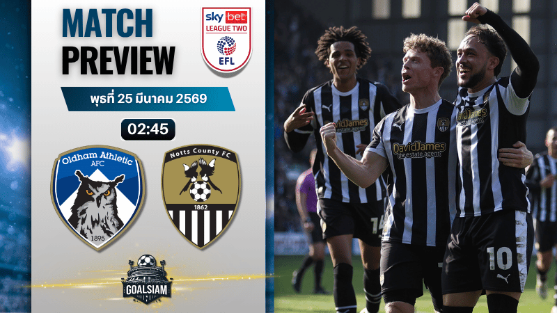 วิเคราะห์บอลก่อนเกม 25 มีนาคม 2569 โอลด์แฮม vs น็อตต์ส เคาน์ตี้ ศึกเดือดลีกทูที่สายล่ากำไรห้ามกะพริบตา