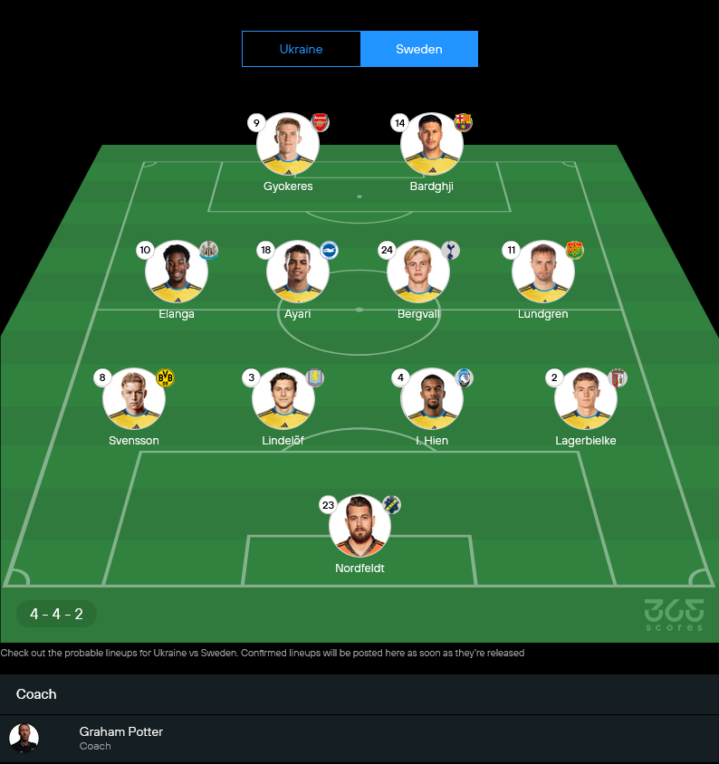 สวีเดนของ เกรแฮม พ็อตเตอร์ ยึด 4-4-2 เป็นหลัก เกมนี้มีตัวเจ็บอย่าง เอมิล คราฟธ์, วิคตอร์ โยฮันส์สัน และต้องลุ้นความฟิตของ อเล็กซานเดอร์ อิซัค ทำให้ภาระเกมรุกตกไปที่ วิคตอร์ โยเคเรส และ รูนี บาร์ดกี เป็นหลัก