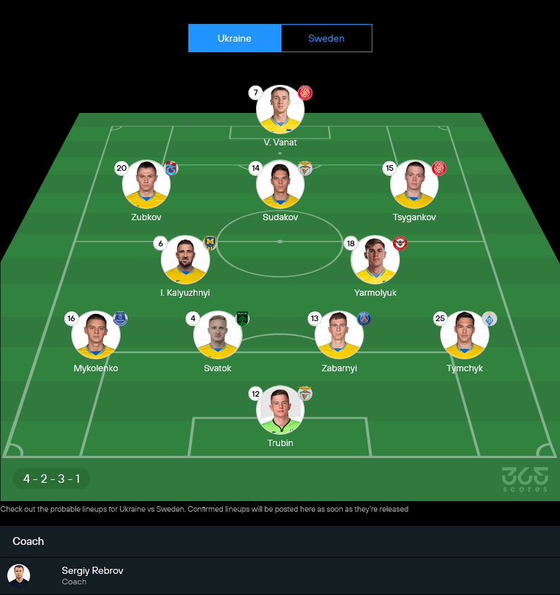 11 ตัวจริงคาดการณ์ ยูเครน (4-2-3-1)