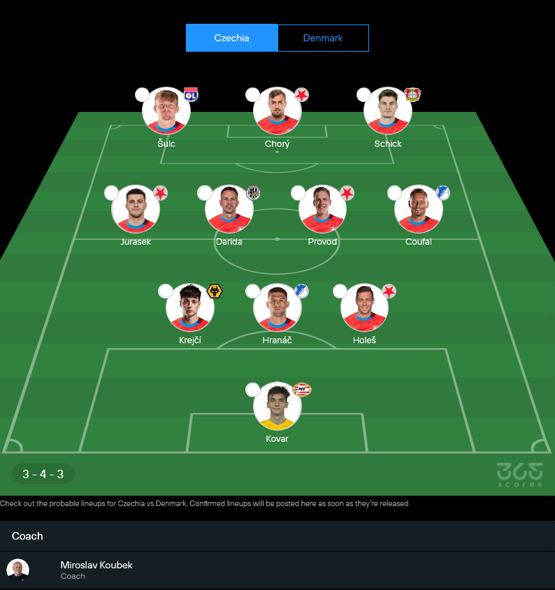 เช็ก คาดว่าใช้แผน 3-4-3