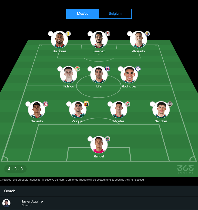 เม็กซิโกมีปัญหาตรงการขาด เอ๊ดสัน อัลวาเรซ กัปตันทีมที่เจ็บเข่า ทำให้แดนกลางต้องปรับพอสมควร แต่แกนหลักรายอื่นยังอยู่กันครบ เกมนี้น่าจะมาในระบบ 4-3-3 เน้นแน่นไว้ก่อน แล้วค่อยอาศัยความขยันของแดนกลางและการเข้าทำจาก ราอูล ฮิเมเนซ เป็นตัวหลัก ในมุม วิเคราะห์บอล ต้องบอกว่าถ้าเม็กซิโกยังยืนเกมรับได้แน่นเหมือนที่ผ่านมา พวกเขาก็ไม่ใช่งานง่ายของเบลเยียมเลย