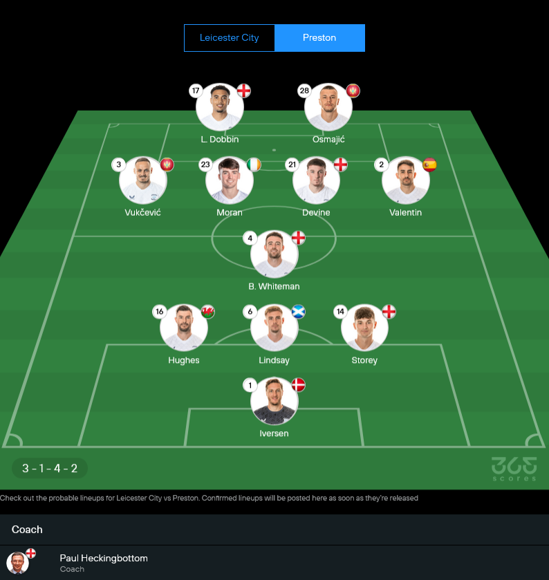 เลสเตอร์ของ แกรี่ โรเว็ตต์ ยังมีตัวเจ็บหลายรายทั้ง จอร์แดน เจมส์, อัสเมียร์ เบโกวิช, ยานนิค เวสเตอร์การ์ด, วิกเตอร์ คริสเตียนเซ่น, แฮร์รี่ ซูตตาร์ และ อารอน แรมซี่ย์ แต่แกนหลักเกมรุกยังพออยู่กันครบ ทำให้เกมนี้น่าจะเดินหน้าในระบบ 4-2-3-1 ตามถนัด ใช้ความเร็วของแนวรุกด้านหลัง ดาก้า เป็นตัวชี้ขาด นี่เป็นมุมสำคัญของ วิเคราะห์บอล เกมนี้เลย เพราะถ้าเจ้าบ้านเร่งจังหวะได้เร็ว เปรสตันมีสิทธิ์โดนกดทั้งเกม