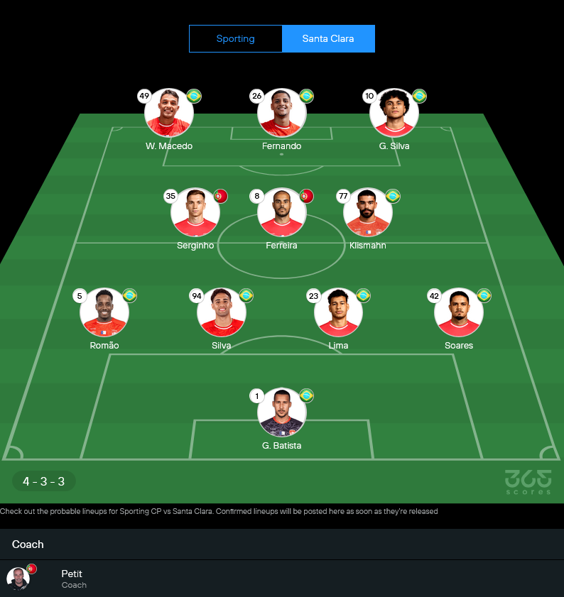 ทีมเยือนสภาพทีมค่อนข้างพร้อม ตัวหลักอยู่กันเกือบครบ มีเพียง มาเธอุส อเราโฮ ที่ยังเจ็บยาว ส่วนที่เหลือพร้อมลงต่อเนื่อง เปอตีต์ น่าจะยึดชุดเดิมในระบบ 4-3-3 เพื่อเน้นความแน่นตรงกลางและรอโต้กลับ