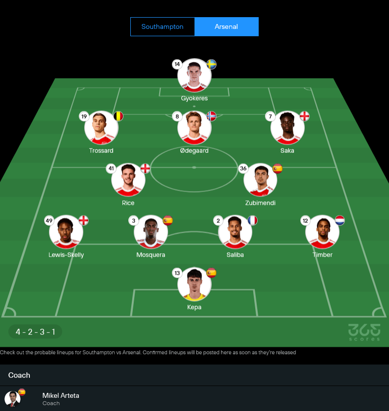 | 05/10/2024 | พรีเมียร์ลีก | อาร์เซน่อล 3-1 เซาธ์แฮมป์ตัน |