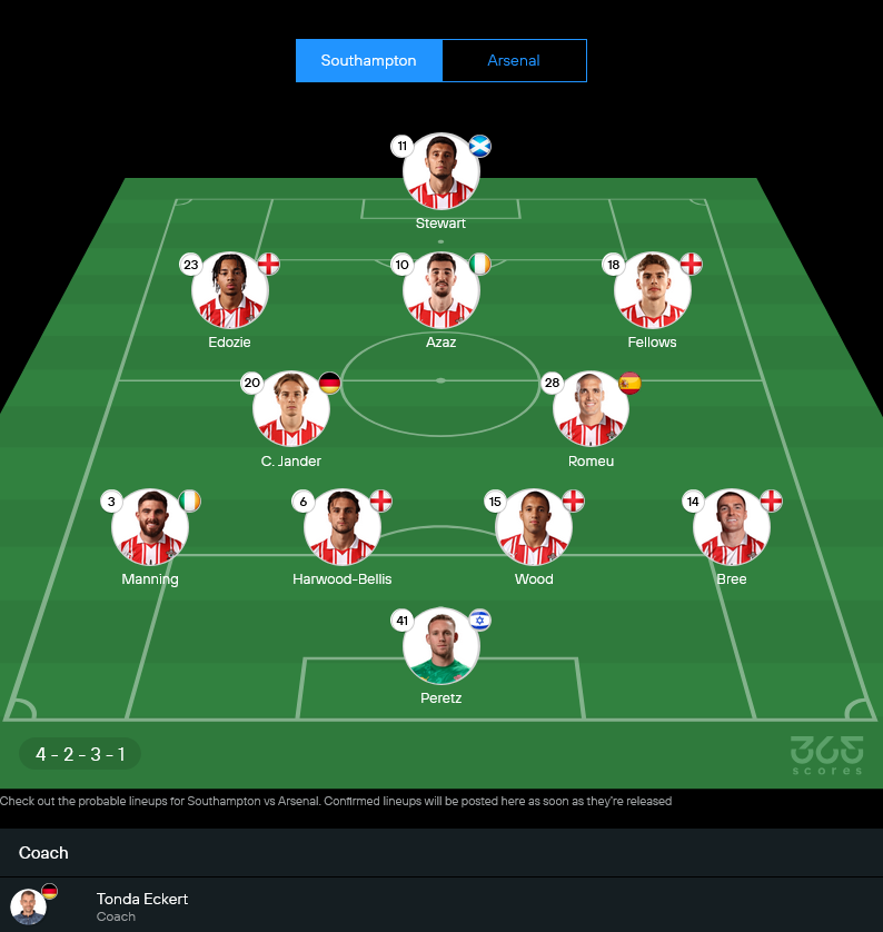 11 ตัวจริงคาดการณ์ เซาธ์แฮมป์ตัน 4-2-3-1