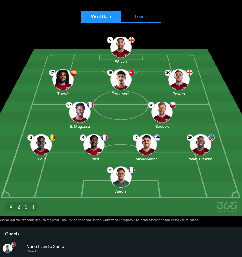 เวสต์แฮมของ นูโน่ เอสปิริโต้ ซานโต ยังมีปัญหาตัวเจ็บรบกวน โดยเฉพาะ ฟาเบียนสกี้, โตดิโบ้ และ ซัมเมอร์วิลล์ แต่แกนหลักที่เหลือยังพร้อมพอให้จัดทีมในระบบ 4-2-3-1 ได้ตามถนัด ซึ่งถ้ามองในเชิง วิเคราะห์บอล จุดน่าสนใจคือการใช้ตัวรุกอย่าง โบเว่น, แฟร์นานเดส และ ตราโอเร่ เล่นงานพื้นที่ด้านข้างของลีดส์