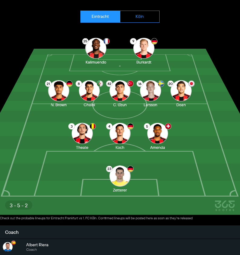 แฟร้งค์เฟิร์ตยังมีตัวเจ็บรบกวนอยู่หลายราย แต่โครงหลักของเกมรุกยังพร้อมใช้งาน โดยเฉพาะคู่หน้าอย่างคาลิมูเอนโด้กับบูร์คาร์ดต์ที่น่าจะได้ล่าตาข่ายร่วมกัน และมีชาน อูซุนคอยเชื่อมเกมอยู่ด้านหลัง รูปแบบการเล่นยังน่าจะยึด 3-5-2 หรือขยับเป็น 3-4-1-2 ตามจังหวะเกม ซึ่งถือว่าเป็นระบบที่เหมาะกับทีมชุดนี้มาก