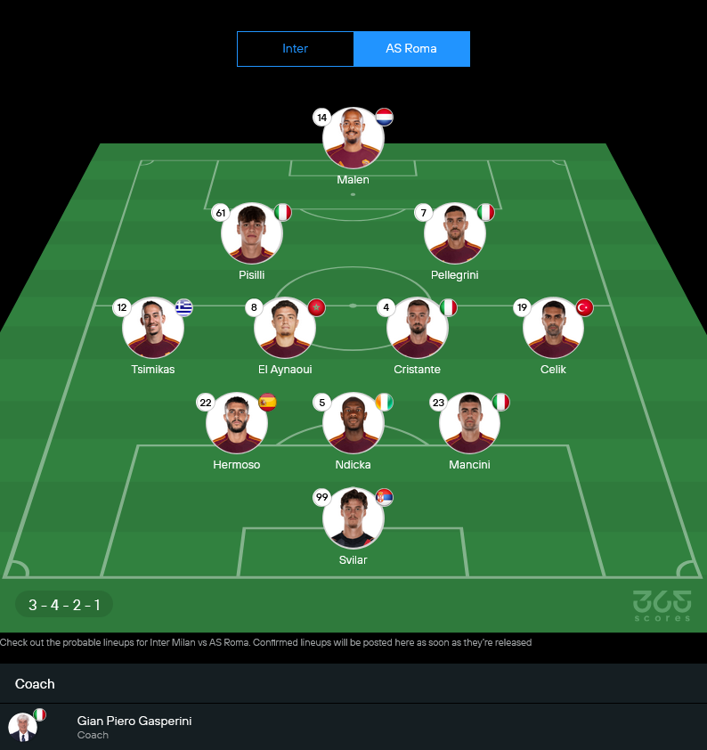 โรม่า ของ จาน ปิเอโร่ กาสเปรินี่ จะมาในระบบ 3-4-2-1 โดยมี มาเลน ยืนเป็นหน้าเป้า และใช้ เปเยกรินี่ กับ ปิสซิลลี่ คอยเชื่อมเกมรุก จุดน่าห่วงคือสภาพทีมยังไม่เต็ม เพราะ ดิบาล่า, ดอฟบิค และ เวสลีย์ ยังไม่พร้อมใช้งาน ทำให้ตัวเลือกแดนหน้าบางลง เกมนี้จึงน่าจะมาเน้นรัดกุม รอสวนมากกว่าจะเปิดแลกตรงๆ