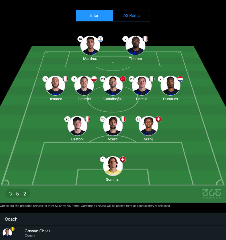 อินเตอร์ของ คริสเตียน คิวู มาในระบบ 3-5-2 ตามถนัด จุดเด่นยังอยู่ที่แดนกลางแน่น วิงแบ็กเติมดุ และเกมรุกมีความอันตรายมากขึ้นเมื่อ เลาตาโร่ มาร์ติเนซ มีลุ้นกลับมาออกสตาร์ท ขณะที่ ตูราม ยังพร้อมปั่นป่วนแนวรับคู่แข่ง ส่วนปัญหามีแค่ คาร์ลอส ออกุสโต้ ติดแบน และ บิสเซ็ค บาดเจ็บ แต่โครงสร้างหลักยังแน่นอยู่ดี ในมุม วิเคราะห์บอล อินเตอร์ดูพร้อมกว่าและเล่นตามแผนตัวเองได้ชัดเจนกว่า