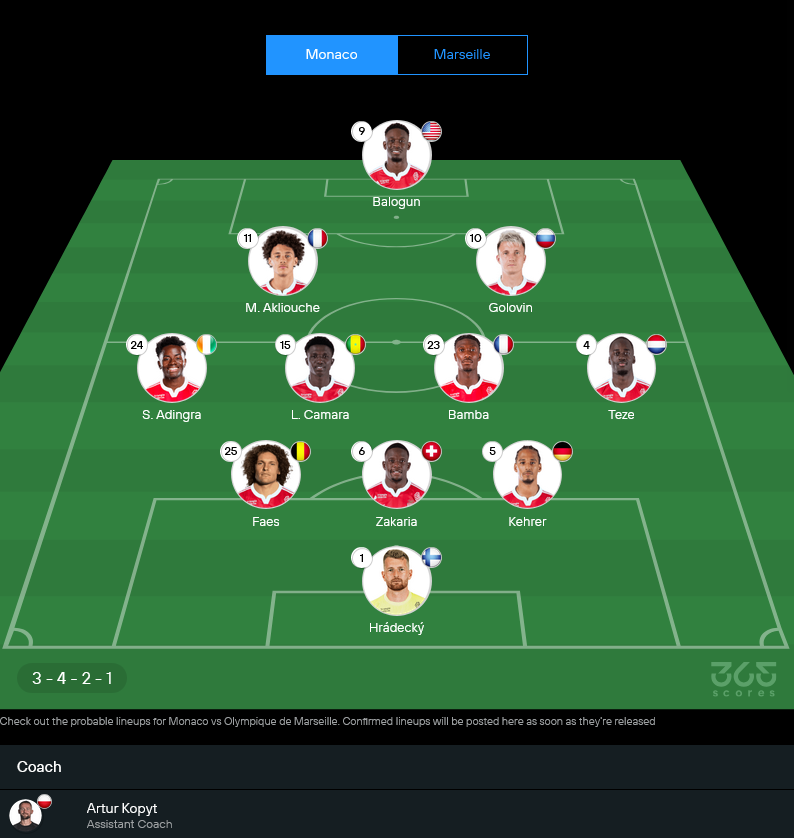 ในมุม วิเคราะห์บอล นัดนี้ เจ้าถิ่นน่าจะยึด 3-4-2-1 เหมือนเดิม โดยมี บาโลกุน ยืนหน้าเป้า และใช้ อัคลิอูช กับ โกโลวิน คอยสนับสนุน เกมรุกของทีมนี้ช่วงหลังไหลลื่นมาก ถ้าตั้งเกมได้เร็ว มาร์กเซยมีเหนื่อยแน่