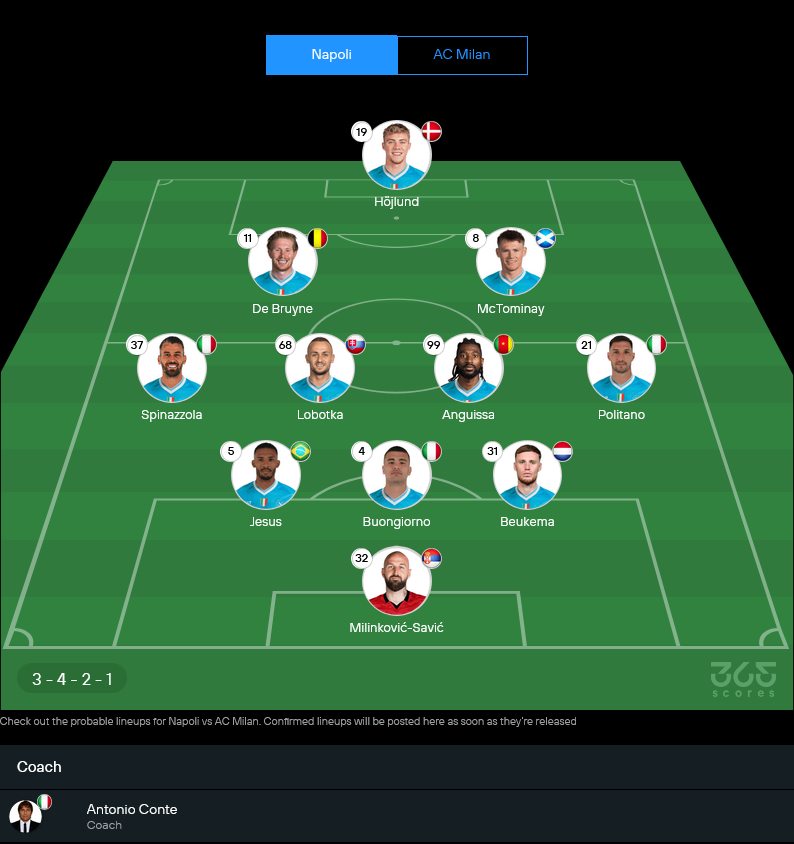 นาโปลีของ อันโตนิโอ คอนเต้ ยังมีตัวเจ็บรบกวนหลายรายทั้ง โรเมลู ลูกากู, ดาวิด เนเรส, อันโตนิโอ แวร์การา ส่วน อามีร์ ราห์มานี่ กับ โจวานนี่ ดิ ลอเรนโซ่ ยังต้องเช็กความฟิต แต่แกนหลักที่พร้อมลงยังน่าสนใจ โดยเฉพาะ เดอ บรอยน์ กับ แม็คโทมิเนย์ ที่จะช่วยกันปั้นเกมอยู่หลัง ฮอยลุนด์ ในระบบ 3-4-2-1 ซึ่งถ้ามองในเชิง วิเคราะห์บอล เกมนี้ จุดแข็งของเจ้าถิ่นยังอยู่ที่แดนกลางและแรงเชียร์ในบ้าน