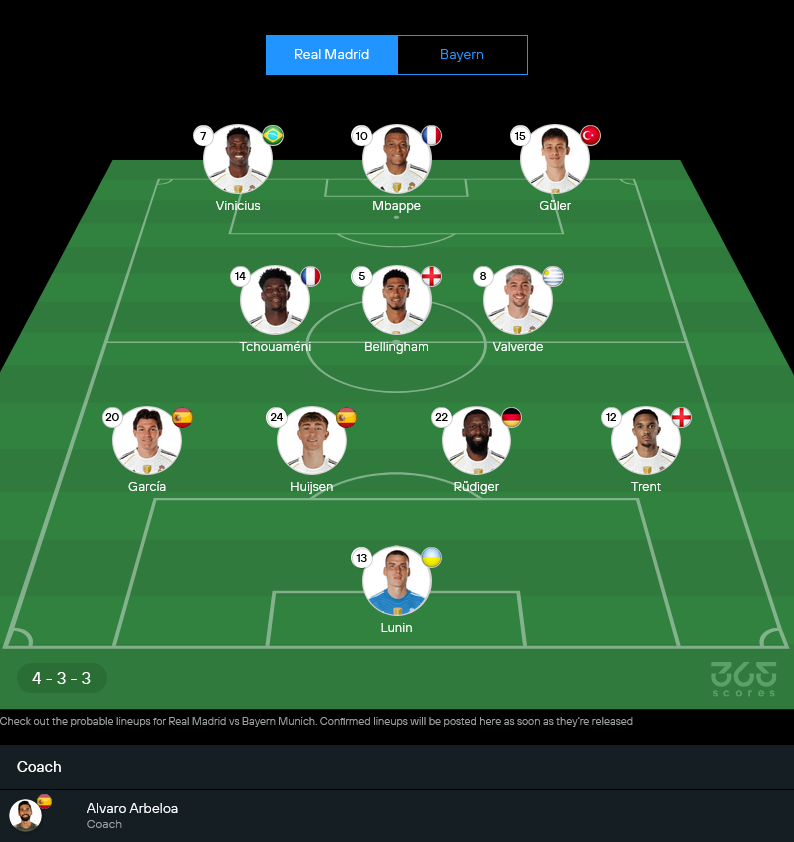 มาดริดน่าจะมาในระบบ 4-3-3 เกมนี้ยังไม่มี ติโบต์ กูร์กตัวส์ และ โรดรีโก้ ที่เจ็บแน่นอน ส่วน ดานี่ เซบาญอส กับ แฟร์กล็องด์ เมนดี้ ยังต้องเช็กอีกที จุดเด่นของทีมยังอยู่ที่แนวรุกความเร็วสูงอย่าง วินิซิอุส และ เอ็มบัปเป้ ที่พร้อมฉีกแนวรับคู่แข่งได้ตลอด