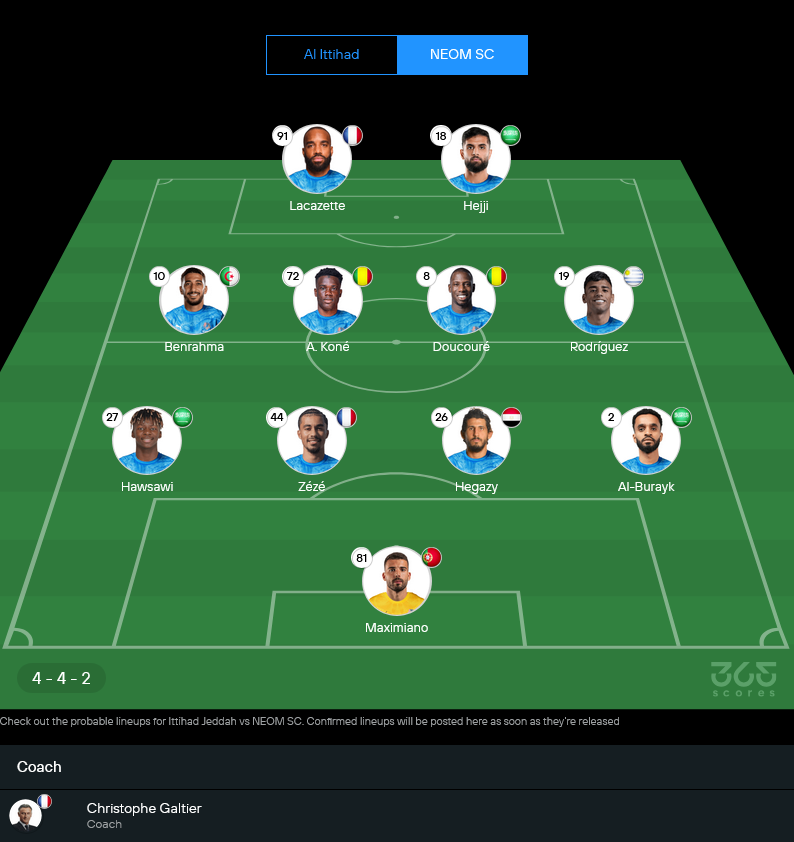ฝั่งนีออมยังไม่มี มาร์ซิน บูลก้า ที่เจ็บยาว ทำให้ มักซิเมียโน่ รับหน้าที่เฝ้าเสาต่อ ส่วนแนวรุกยังฝากความหวังไว้ที่ ลากาแซตต์, เบนราห์มา และโรดริเกซ ระบบที่ใช้คาดว่าเป็น 4-4-2 เน้นเกมรับรัดกุมแล้วสวนกลับเร็ว