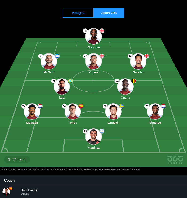 วิลล่าของ เอเมรี่ จะมาในระบบ 4-2-3-1 เหมือนกัน จุดที่ต้องเช็กคือ บูบาการ์ กามาร่า ที่ยังเจ็บ ส่วน เจดอน ซานโช่ ก็มีปัญหาอาการบาดเจ็บ แต่ในไลน์อัพคาดการณ์ยังมีชื่ออยู่ ขณะที่ รอสส์ บาร์คลีย์ ไม่มีชื่อในชุดยุโรป