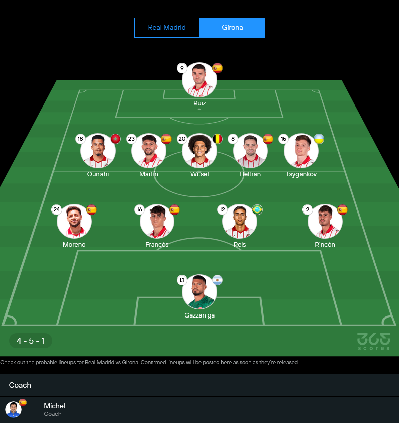จีโรน่าของ มิเชล ยังเจอปัญหาตัวเจ็บหลายราย ทั้ง ไบรอัน กิล, ดอนนี่ ฟาน เดอ เบค, ฮวน การ์ลอส, มาร์ก อังเดร แทร์ สเตเก้น, ปอร์ตู, ริการ์ด อาร์เตโร่ และ วลาดิสลาฟ วานัต ส่วน อาร์เนา มาร์ติเนซ กับ ดาเลย์ บลินด์ ยังต้องลุ้นความฟิต คาดว่าจะมาในระบบ 4-5-1 หรือขยับเป็นเกมรับเต็มตัวเมื่อไม่มีบอล หวังแพ็กกลางแน่นแล้วใช้จังหวะสวนกลับเล่นงานเจ้าถิ่น