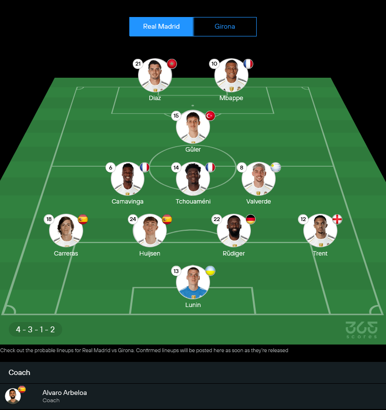 เรอัล มาดริด ของ อัลบาโร อาร์เบโลอา ยังขาด ฟรังโก้ มาสตานตูโอโน่ ที่ติดโทษแบน ส่วนแข้งเจ็บมี แฟร์กล็องด์ เมนดี้, โจน มาร์ติเนซ, โรดรีโก้ และ ติโบต์ กูร์กตัวส์ โดยภาพรวมทีมยังมีคุณภาพมากพอจะเดินเกมรุกเต็มตัว แผนที่คาดคือ 4-3-1-2 ซึ่งเหมาะกับเกมลักษณะนี้ เพราะกลางสนามแน่นและคู่หน้ามีความเร็วพอจะฉีกแนวรับจีโรน่าได้ตลอด ในมุม วิเคราะห์บอล ถือว่าเจ้าถิ่นยังดูอันตรายกว่าเยอะ