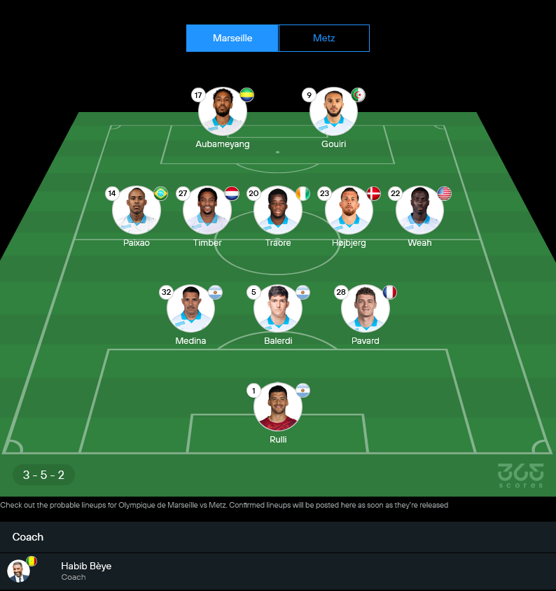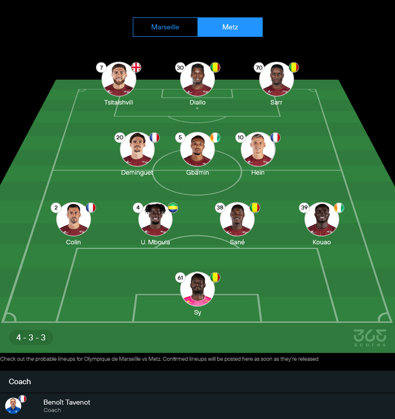 เม็ตซ์ของ เบอนัวต์ ตาเวอนอต ยังมีตัวเจ็บหลายราย ไม่ว่าจะเป็น เบนฌาแม็ง สต็องบูลี, บูบาการ์ ตราโอเร่ และ อิสมาเอล เกอร์ตี ทำให้ตัวเลือกค่อนข้างจำกัด เกมนี้น่าจะยืน 4-3-3 แล้วถอยลงไปรับลึกเพื่อรอสวนกลับ