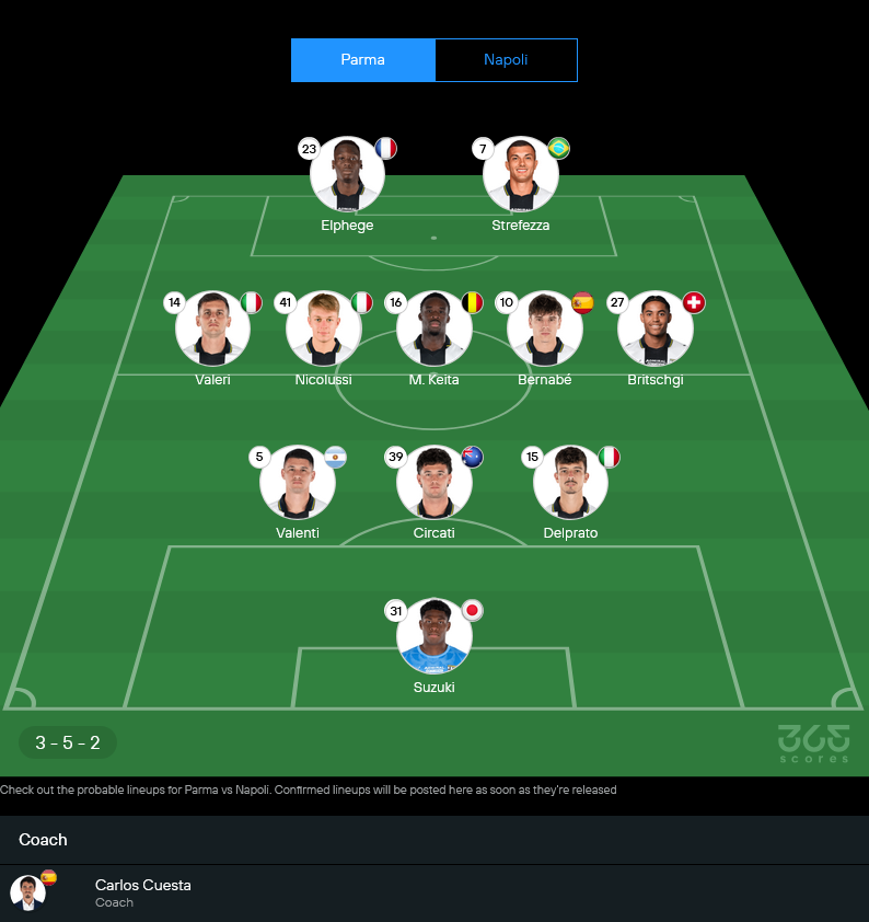ปาร์ม่าของ คาร์ลอส คูเอสต้า ยังมีปัญหาเรื่องความพร้อมพอสมควร โดยจะไม่มี มาเตโอ เปลเลกริโน่ ที่ติดแบน ส่วนตัวเจ็บยังมี เบนจามิน เครมาสชี่ กับ มาติย่า ฟริกัน ขณะที่ เบร์นาเบ ยังต้องรอเช็กก่อนเกม