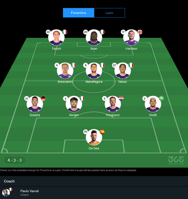 11 ตัวจริงคาดการณ์ ฟิออเรนติน่า 4-3-3