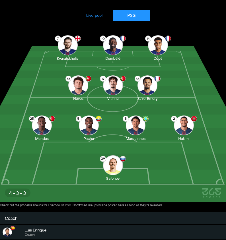 - กองหน้า : Doué – 7.5, Dembélé – 7.9, Kvaratskhelia – 7.8