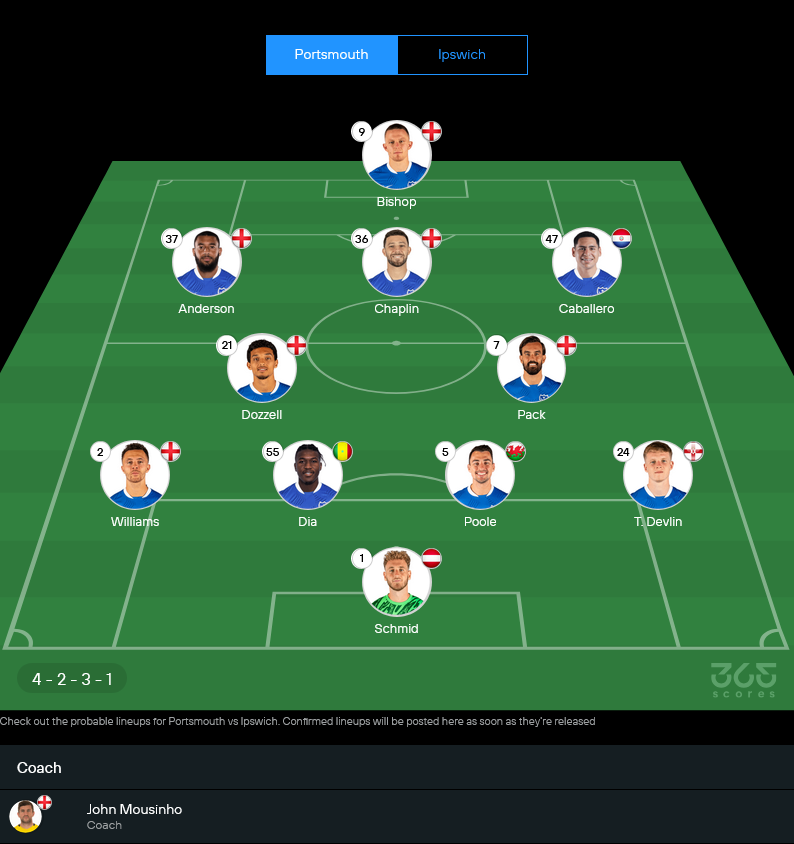 พอร์ทสมัธของจอห์น มูซินโญ่ น่าจะยึดระบบ 4-2-3-1 ต่อไป ตัวเจ็บยังมี แซค สวอนสัน, มาร์ค คอสซ์โนฟสกี้, ฟรังโก อูเมห์, ฟลอเรียน เบียนคินี่ และจอช เมอร์ฟี่ ส่วนเอโบว์ อดัมส์ ยังต้องลุ้นความฟิต ขณะที่คอเนอร์ โอกิลวี่ติดโทษแบน และคอเนอร์ แชปลินลงไม่ได้