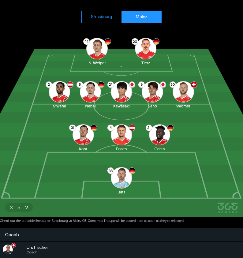 ไมนซ์ของเออร์ส ฟิสเชอร์ เตรียมยึดแผน 3-5-2 เหมือนเดิม แม้ลิสต์ตัวเจ็บจะยาวพอตัวทั้ง โรบิน เซนท์เนอร์, สเตฟาน เบลล์, อันเดรียส ฮันเช-โอลเซ่น, มักซิม ดาล, มักซิม ไลท์ช์, แจ ซุง ลี, เบเนดิกต์ ฮอลเลอร์บาค และ ซิลาส แต่โครงสร้างหลักยังเอาอยู่ เกมนี้คงมาเน้นรับให้แน่นแล้วรอสวนแบบเขี้ยวๆ