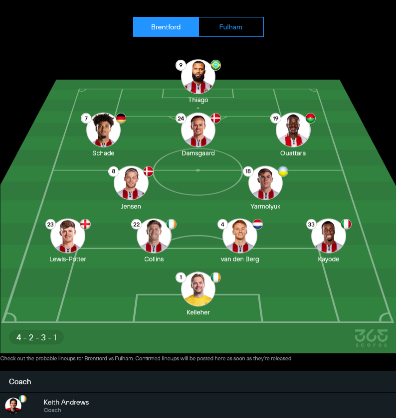 เบรนท์ฟอร์ดของคีธ แอนดรูว์สยังเจอปัญหาตัวเจ็บเล่นงานหลายราย ทั้ง อันโตนี่ มิลัมโบ, ฟาบิโอ คาร์วัลโญ่, จอร์แดน เฮนเดอร์สัน, รีสส์ เนลสัน, ริโก้ เฮนรี่ และวิตาลี ยาร์โมลยุก แต่แกนหลักที่เหลือยังพอประคองทีมได้ในระบบ 4-2-3-1