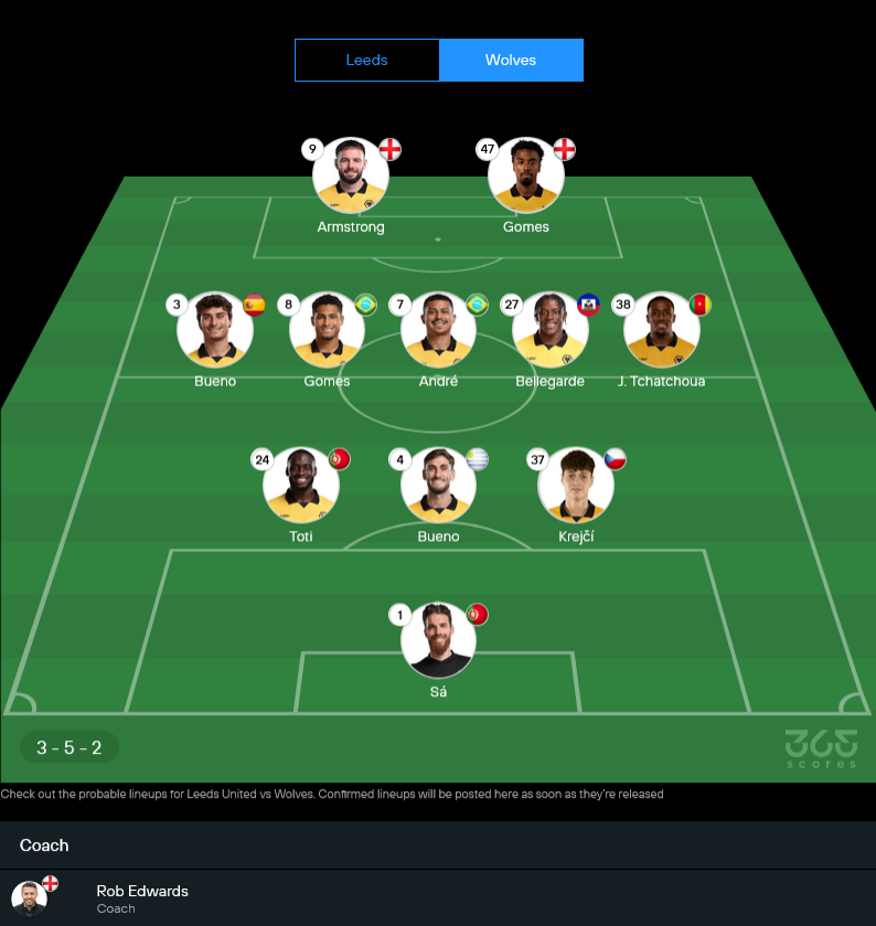 วูล์ฟส์ของ ร็อบ เอ็ดเวิร์ดส์ ยังมีปัญหาทั้งตัวแบนและตัวเจ็บ เยอร์สัน มอสเกรา ติดโทษแบน ขณะที่ เอ็นโซ่ กอนซาเลซ, แม็ตต์ โดเฮอร์ตี้ และ แซม จอห์นสโตน ยังไม่พร้อมลงสนาม จากภาพรวมทีมคาดว่าจะมาในระบบ 3-5-2 โดยใช้ อดัม อาร์มสตรอง จับคู่กับโกเมสในแนวรุก จุดสำคัญคือเกมรับต้องนิ่งกว่าที่ผ่านมา เพราะถ้ายังพลาดง่ายเหมือนเกมเยือนหลายๆ นัด มีสิทธิ์โดนลีดส์เล่นงานยาว ในมุม วิเคราะห์บอล วูล์ฟส์ยังพอมีจังหวะสวนกลับ แต่ปัญหาคือความสม่ำเสมอยังต่ำมาก