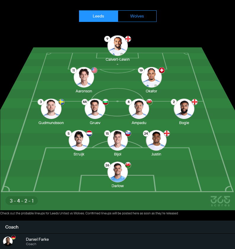 ลีดส์ของ ดาเนี่ยล ฟาร์เก้ ยังมีตัวเจ็บหลายราย ทั้ง อันตอน สตัค, แดเนี่ยล เจมส์ และ โจ โรดอน ส่วน อาโอะ ทานากะ ยังต้องเช็กฟิต ทำให้ทีมยังน่าจะยึดระบบ 3-4-2-1 เหมือนเดิม โดยฝากความหวังไว้ที่โดมินิก คัลเวิร์ต-เลวิน ยืนหน้าเป้า และมีอารอนสันกับโอคาฟอร์คอยปั้นเกมอยู่ด้านหลัง ในเชิง วิเคราะห์บอล ถือว่าลีดส์มีโครงสร้างเกมรุกชัดเจนกว่า โดยเฉพาะการขึ้นเกมด้านข้างและการบีบพื้นที่แดนกลาง