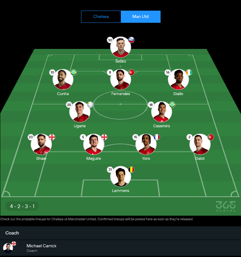 แมนยูของไมเคิ่ล คาร์ริค ก็มาในระบบ 4-2-3-1 เช่นกัน นำโดย เซนเน่ ลัมเมนส์ ในประตู แผงหลังมี ชอว์, แม็กไกวร์, โยโร่ และ ดาโลต์ กลางสนามใช้ อูการ์เต้ กับ คาเซมิโร่ ส่วนแนวรุกเป็น คุนญ่า, บรูโน่ แฟร์นานเดส และ ดิยัลโล่ สนับสนุน เบนยามิน เซสโก้